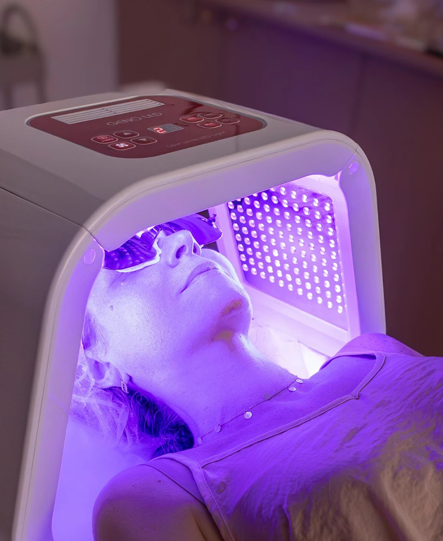 After a consultation to determine the appropriate light wavelength for your concern, you will be positioned comfortably beneath the LED panel. Protective goggles are provided. The treatment itself requires no effort on your part — simply relax for 20–30 minutes while the light energy penetrates the skin at a cellular level.